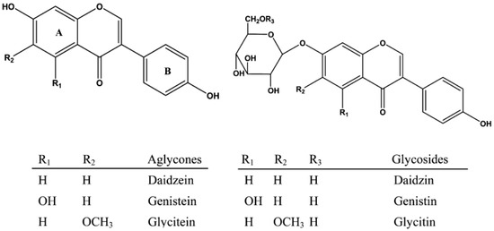 Soybean sprouts are one of the most favorable healthy food by consumers in many countries—especially Korea, China and Japan. Sprouting soybean (Glycine max L.) are high in quality protein and dietary fiber and containing a lot of functional materials, including isoflavones. Consumption of isoflavones are associated with human health benefits, such as decreased risk of heart disease, menopausal symptoms, cardiovascular disease, as well as breast prostate cancers [1,2,3]. Isoflavones are categorized chemically according to their functional group, such as glycosides (daidzin, glycitin, genistin) and agylcones (daidzein, glycitein, genistein) (Figure 1).