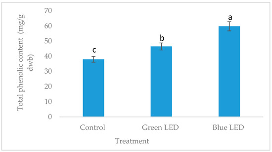 Total phenolic content in soybean sprouts grown under different light. Different lowercase letters within the row indicates significant differences (p < 0.05) according to ANOVA. LED: light emitting diode.