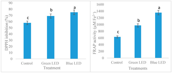 Antioxidant capacity (DPPH and FRAP) of soybean sprout under different light treatment. The values are mean ± SE. (n = 3). DPPH, 2-diphenyl-1 picryl hydrazyl; FRAP, Ferric Reduction Antioxidant Power; SE, standard deviation. Different lowercase letters within the row indicates significant differences (p < 0.05) according to ANOVA.