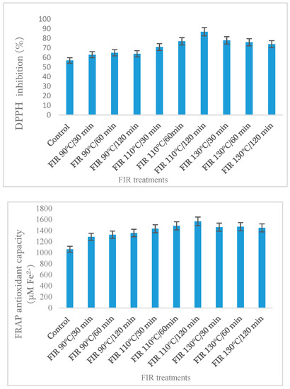 It is observed in Figure 4 that FIR 110 °C/120 min treatment had the highest FRAP value (1568 µM Fe2+) among the FIR treatments. Comparing our results with the previous results by Ghimeary et al. [18] demonstrated that FIR treatment enhanced DPPH inhibition of the buckwheat. This result is also in agreement with the finding of Randhir er al. [26] where they showed that thermal treatment increased DPPH activity in buckwheat sprout. Our findings are concordant with previous results of total phenol content (Figure 2), showing the phenolics that reacts in Folin–Ciocalteu reaction has a similar interaction in FRAP reaction. Previous study showed higher phenolic and flavonoid content in buckwheat, which was directly correlated with their higher reduction powder [18].
