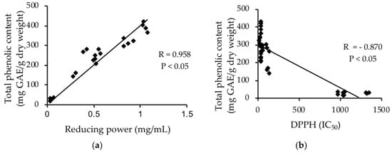 Correlation between total phenolic content and antioxidant capacities measured by DPPH and reducing power in Australian native herbs. (a) Correlation between reducing power and total phenolic content; (b) Correlation between DPPH and total phenolic content.
