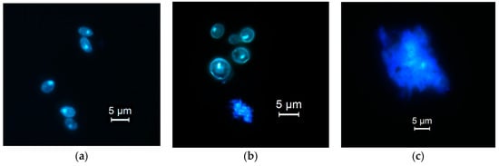 Lemon myrtle hexane extract showed the most effective anti-yeast activity and selected to investigate the antifungal mechanism of action against S. cerevisiae. S. cerevisiae is a widely studied eukaryotic model yeast with a relatively large cell size for better observation and investigation for morphological changes []. The mechanism of antifungal action of hydrophobic bioactive compounds is reported as penetrating and damaging cellular cytoplasmic membrane [,]. Images of S. cerevisiae untreated, 30 min and 60 min treated cells are given in Figure 2. The untreated cells appear to have a normal elongated-oval shape with no signs of deformation or damage to cell structure (Figure 2a). Cells exposed to treatment for a period of 30 min have undergone structural modification where cells became swollen and changed from being oval into a circular shape; in addition, in some cells the membrane collapsed and reduced in size (Figure 2b). When treatment increased to 60 min, cell damage became more profound showing cells with ruptured membrane (Figure 2c). The DAPI staining observed to be brighter on damaged cells compared to non-damaged cells this could be due to the stain accumulating on the rough layer of damaged cell membrane. It was also noticeable when cells were exposed to the fluorescence microscope light source for a longer period, the stain started to fade away at a faster rate only in membrane ruptured cells. This phenomenon indicates that the stain is contained within the boundary of non-ruptured cells and is protected inside the cell and requires a longer light exposure time to fade away compared to the stain that has leaked out of the damaged cells.