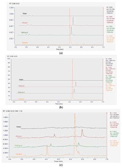 Chromatogram of major compounds extracted from Australian native herbs in different solvents. Citral in lemon myrtle extracts (a); polygodial in Tasmanian pepper leaf extracts (b) and anethole in anise myrtle extracts (c).