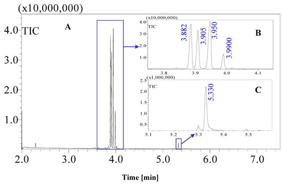 Total ion chromatogram (TIC) of an oximated-silylated date juice sample. Several peaks were obtained at different retention times (e.g., 2.3, 3.88, 3.905, 3.95, 3.99, 5.3 and 5.33 min). (A) Whole date juice chromatogram for a 7-min measurement; (B) the date juice chromatogram from 3.8–4.1 min; (C) the date juice chromatogram from 5.1–5.5 min.