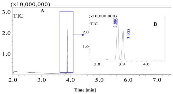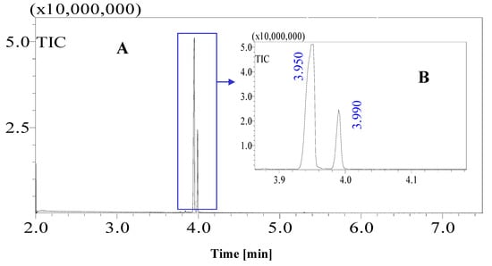 Total ion chromatogram (TIC) of standard d-glucose. Chromatograph of the oximated and silylated glucose sample was obtained. Glucose syn and anti-forms were observed at 3.95 and 3.99 min. (A) Total chromatogram of a standard glucose sample for a 7-min measurement; (B) the glucose standard sample from 3.9–4.1 min.