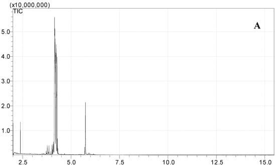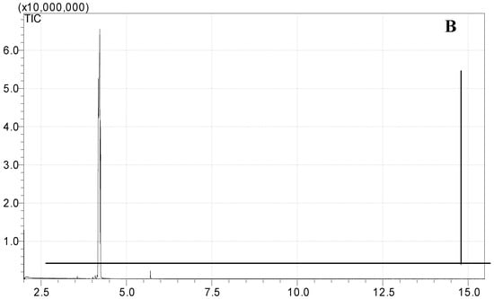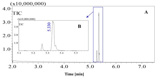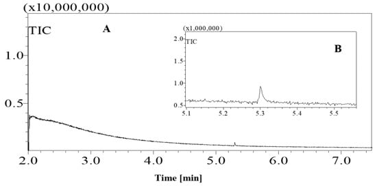 Total ion chromatogram (TIC) of the blank sample (pyridine). (A) Whole chromatogram of the blank sample for a 7-min measurement; (B) chromatogram of the blank sample from 5.1–5.5 min.