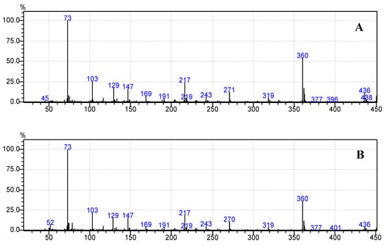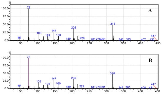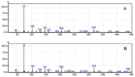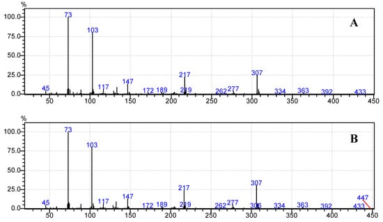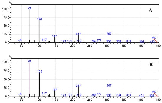 Mass spectrum at a retention time of 3.99 min. (A) Standard d-glucose; (B) Date juice.