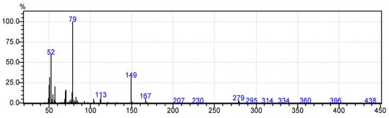 Figure 1 shows the chromatograms of date juice. The retention times of the main peaks (e.g., 3.88, 3.905, 3.95, 3.90 and 5.33 min) were compared with the retention times of the individual standards of fructose (Figure 2), d-glucose (Figure 3) and sucrose (Figure 4). The retention times were identical; consequently, fructose, glucose and sucrose were detected in date juice. Furthermore, these results reveal two peaks for each of the six-carbon sugars, while only one peak was observed for sucrose; these results agree with the results of other reports [,]. Moreover, the mass spectra of the individual peaks of date juice were similar to the spectra of the analysed standard sugars. In addition, characteristic fragments (m/z) were obtained. A base peak was obtained at m/z 73. This fragment is characteristic of silylation and results from cleavage of the TMS group. Furthermore, fragments at (m/z) 103, 117, 147, 160, 191, 205, 217, 291 and 319 were observed for fructose and glucose, as shown in Figure 6, Figure 7, Figure 8 and Figure 9. These fragments are characteristic of glucose and fructose as demonstrated [,].