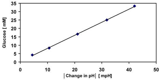 A method was developed to determine the sugar contents in date juice by measuring the change in the solution pH during glucose phosphorylation. A calibration curve was prepared by measuring the change in the solution pH against standard samples of different glucose concentrations, as shown in Figure 13. The plotted values for the change in pH are the average of three measured values with an average standard deviation of ±0.008%. A linear relationship was obtained between the change in pH and the glucose concentration (for glucose concentrations of 4.2–42 mM). The following equation revealed this linear relationship:
