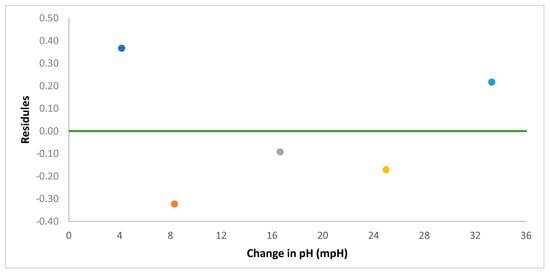 Residual plot of the data of glucose concentration that plotted against the measured change in pH.
