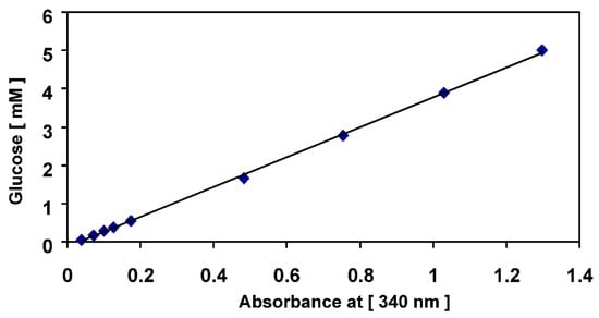 Figure 15 represents a calibration curve of the absorbance values that were measured against different standard glucose concentrations. This calibration curve was obtained by following the enzymatic assay, K-SUFRG, described by Megazyme []. The plotted absorbance values are an average of three measured values with an average standard deviation of ±0.04. In this test, reasonable results were obtained for glucose concentrations (0.05–5 mM) because the calibration curve is a straight line in this concentration range. However, the sample must be diluted for glucose concentrations above 5 mM. The linear relationship between the glucose concentration and absorbance is outlined below: