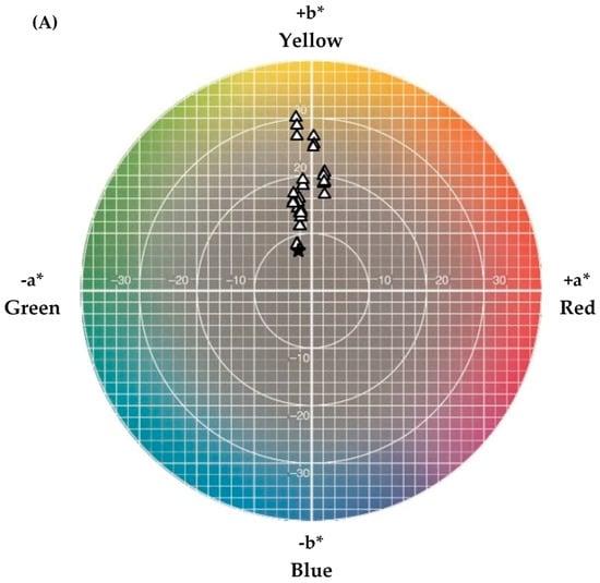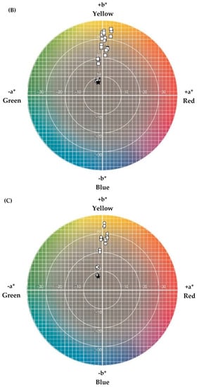 According to Leclercq-Perlat et al. [], the color intensity of pigments produced by Brevibacterium linens, which is part of microorganisms found at the surface of smear-ripened cheeses, was higher when using D. hansenii for deacidification, than K. marxianus. In addition, significant differences of the color intensity provided by ripening bacteria, in combination with different strains of D. hansenii, have been demonstrated []. However, besides the yeast strains used in the deacidification of the cheeses, other factors, such as light, pH, temperature, and salt concentration, can also influence the pigmentation of cheese-ripening bacteria [,,,].