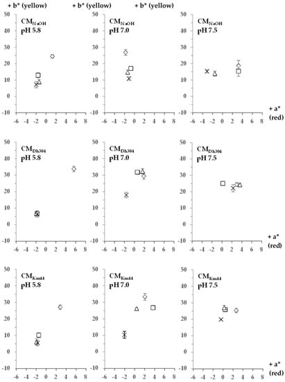 When considering the color of A. arilaitensis Po102 cultures on CMDh304 and CMKm44 at initial pH values higher than 5.8, with 0–4% (w/v) NaCl, whose conditions were probably more suitable for the growth of the A. arilaitensis strain in the present study, the color attributes, including a*, b*, C*, and h° value, varied greatly among these media. In addition, during the incubation period, the changes in color and pH were diversified. These results could refer to the relation between the yeast strains used for the deacidification, and the pigment production of this bacterial strain. For the media prepared by biological deacidification, yeast cells were eliminated by pasteurization when the pH of the media reached the value required. For this reason, the pigmentation of A. arilaitensis Po102 was possibly impacted by the difference in biochemical composition of CMDh304 and CMKm44. Leclercq-Perlat et al. [] reported that K. marxiamus required more lactose and lactate than D. hansenii for their growth during the deacidification; therefore, the ripening bacteria probably did not have sufficient lactate to produce energy for their growth. This resulted in a variation of the cell biomass, which directly influenced the color. Furthermore, the ability to produce pigments of A. arilaitensis appeared to depend on the type of amino acids and caseinate present in the milk media []. According to Roostita and Fleet [], D. hansenii was able to produce several free amino acids (predominantly proline, alanine, glycine, arginine, and glutamic acid) and free fatty acid, during its growth in milk. This probably affected the growth and, thus, pigment production of the ripening bacteria A. arilaitensis Po102.
