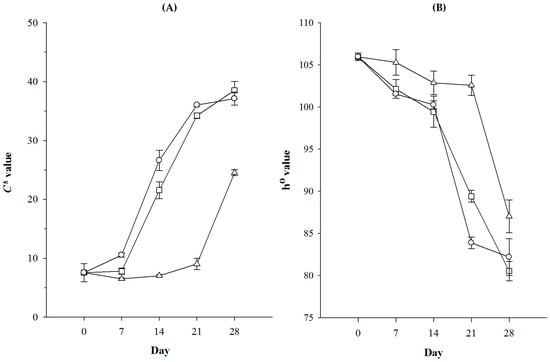 Changes in color saturations (A) and hues (B) of Arthrobacter arilaitensis Po102 cultures during growth on different deacidified cheese-based solid media at initial pH 5.8 without adding NaCl. ∆ = CMNaOH, □ = CMDh304, and ○ = CMKm44.