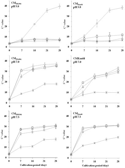 The color attributes of A. arilaitensis Po102 cultures versus time were observed during the cultivation period on day (d) 7, 14, 21, and 28. Detailed positions of cultures of the A. arilaitensis strain, when projected in the CIE L*a*b* colorimetric scale after d 28 incubation, are shown in Figure 2. Among the same category, i.e., initial pH and NaCl concentration, the overall changes during the cultivation on CMDh304 and CMKm44 appeared to be dependent on these variables. With the exception of the set at 0% NaCl, the color coordinate values obtained from all types of media at pH value 5.8, evolved very slightly throughout the cultivation period.