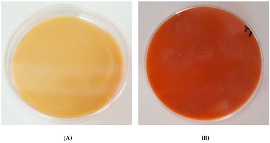 The procedure for preparing the experimental media employed in this study was adapted according to Leclercq-Perlat et al. [], Rea et al. [], and Masoud and Jakobsen []. The cheese-based (curd) media were prepared in two steps: (i) the pH adjustment by chemical or biological deacidification, depending on the observation of coloration influenced by yeasts; and (ii) the inoculation of bacterial strains on the media surface.