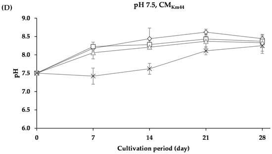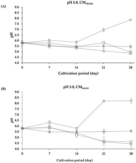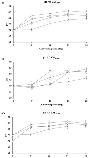 As shown in Figure 6, pH of the cultures of A. arilaitensis Po102 changed slightly when the bacterial strain grew on the media containing NaCl concentrations, whereas the pH changes were manifest when grown on media without NaCl. However, when the initial pH value was higher than 5.8, patterns of the changes in pH of A. arilaitensis Po102 cultures were dissimilar. Two different patterns were clearly observable on both CMDh304 and CMKm44, with initial pH values of 7.0 and 7.5, i.e., (i) pH augmented rapidly during the first 7 days, and after that, slowly, and (ii) pH changed slightly during 7 or 14 days, and then increased rapidly (Figure 7).