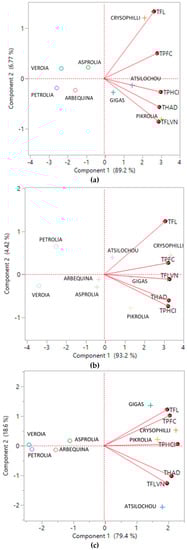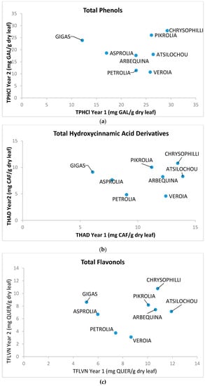 3.2. Content of OLF Polar Extracts in Total Hydroxycinnamic Acid Derivatives (THAD), Total Flavonols (TFLVN), and Total Flavonoids (TFL)