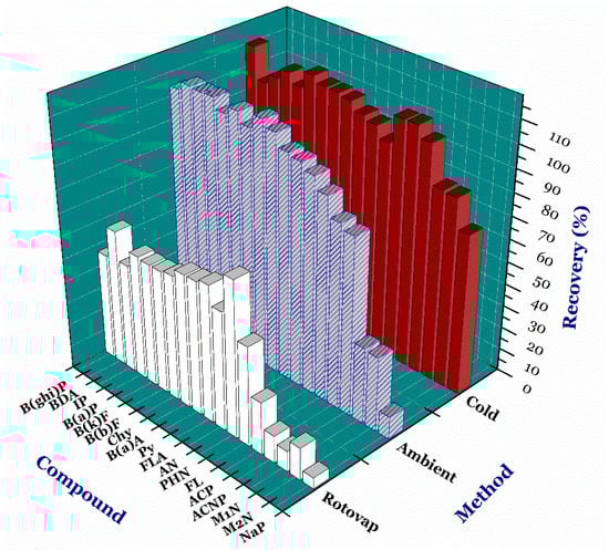 For the rotovap method, the PAH compounds were volatilized easily and rapidly (the recoveries are approximately from 5% to 70%). In contrast, the cold method demonstrated the optimum results (the recoveries of 18 PAH compounds as expected in the range of around 71% to 110%). Meanwhile, the ambient method indicated the low recoveries of naphthalene (NaP; 10.04%), 1-methylnaphthalene (M2N; 33.17%), and 1-methylnaphthalene (M1N; 34.02%). In fact, at 25 °C, substances have a strong volatility (the vapor pressure from 9 Pa to 12 Pa). In addition, a high temperature (approximately 30 °C) and consecutive flow of nitrogen gas possibly contributed to increasing the volatility of these substances. Therefore, the volatilization of the solvent at the low temperature combined with the nitrogen assistance resulted from an excellent recovery (>84%; with the exception of NaP having the recovery =71%) and a minimal sample loss of the compounds. Hence, the cold method was selected to prepare selective samples in this study.