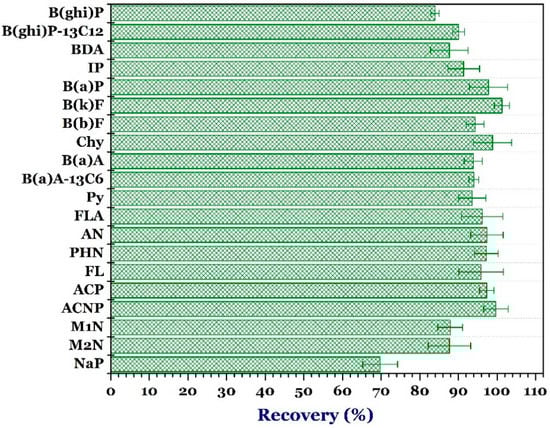Figure 2 shows that the recovery of 18 PAHs ranged approximately from 70% to 101%. Some PAHs (i.e., NaP, M2N, and M1N) had a low recovery because they are volatile compounds. In addition, the high molecular weight compounds (i.e., indeno(1,2,3-cd)pyrene (IP), dibenz(a,h)anthracene (BDA), and benzo(g,h,i)perylence (B(ghi)P)) indicated a low recovery efficiency due to the results of using C18 to eliminate and absorbing fat available in the samples. The high molecular weight can be also adsorbed by C18. Notably, the recovery of isotopic standards was more than 90% and did not indicate the loss of sample. For the identification purpose of multiple compounds simultaneously in one analytical process, the recovery of the substances exceeded 80% (exception for NaP recovered at 70%). As expected, the process was highly quantitative, enabling the identification and quantification of the concentration of PAHs in the food samples.