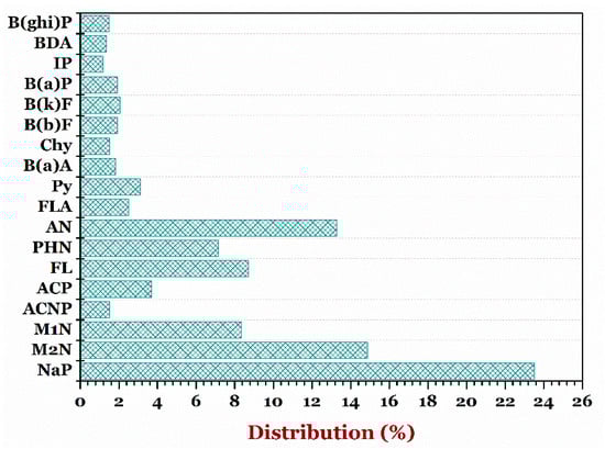 Distribution percentage of diffident kinds of polycyclic aromatic hydrocarbons. Note: naphthalene, NaP; 2-methylnaphthalene, M2N; 1-methylnaphthalene, M1N; acenaphthylene, ACNP; acenaphthene, ACP; fluorene, FL; phenalthrene, PHN; anthracene, AN; floranthene, FLA; pyrene, Py; benzo(a)athracene, B(a)A; chrysene, Chy; benzo(b)fluoranthene, B(b)F, benzo(k)fluoranthene, B(k)F; benzo(a)pyrene, B(a)P; indeno(1,2,3-cd)pyrene, IP; dibenz(a,h)anthracene, BDA; and benzo(g,h,i)perylence, B(ghi)P.