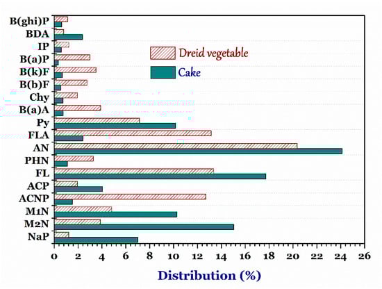 Figure 4 indicates that the PAHs content was partly dependent on the processing methods and characteristics of raw materials. PAHs in the cake primarily exist in light molecular weight and low toxicity, while the opposite was true for PAHs in the dried vegetables (heavier molecular weight and higher toxicity) []. In the cake samples, the ranges of average concentrations (n = 26) of PAHs and B(a)P were 0.22–2.48 µg/kg and 0.34–0.93 µg/kg, respectively (Table 2). The total high PAH contents were found in the starch-containing samples (the cakes) and oil-dried process at a high temperature (>200 °C) within an oxygen-deficient environment. The EC Regulation (No 1881/2006) has set the maximum allowed level (MLS) for B(a)P in cereal-based food as 1.00 µg/kg []. The maximum average distribution of B(a)P content (0.93 µg/kg) was lower than EC standard (equalizing to EC LOD value). Specifically, the average distribution of B(a)P content accumulated in the oil-dried samples (0.71–0.93 µg/kg) was significantly higher than that in the electric stove-dried samples (0.34 µg/kg). Notably, the concentrations of PAHs (ND–26.92 µg/kg) and B(a)P (ND–1.33 µg/kg) determined in the collected cake samples were remarkably lower than the corresponding values in the literature. For example, Iwegbue et al. [] reported the total contents of 16 PAHs in many kinds of cakes (18.4–880.3 µg/kg), as well aschrysene content (0.1–66.4 µg/kg), and B(a)P content (0.1–50 µg/kg). The dissimilar results resulted from the different baking methods, fuel types, raw materials, and baking temperatures. Furthermore, individual PAH percentages were indirectly proportional to the ring numbers of PAH compounds. For example, the three-ring and four-ring PAH compounds primarily include phenanthrene, fluoranthene, and pyrene. The concentrations of three compounds increased when the baking temperature was higher than 220 °C []. Moreover, a high baking temperature (260 °C) caused an increase in the appearance of pyrene, chrysene and benzo(a)anthracene []. In fact, when the baking temperature increased, the transformation of low molecular weight PAHs into high molecular weight ones also increased [].