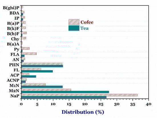 Distribution percentage of individual PAH in the tea and coffee samples. Note: Naphthalene, NaP; 2-methylnaphthalene, M2N; 1-methylnaphthalene, M1N; acenaphthylene, ACNP; acenaphthene, ACP; fluorene, FL; phenalthrene, PHN; anthracene, AN; floranthene, FLA; pyrene, Py; benzo(a)athracene, B(a)A; chrysene, Chy; benzo(b)fluoranthene, B(b)F, benzo(k)fluoranthene, B(k)F; benzo(a)pyrene, B(a)P; indeno(1,2,3-cd)pyrene, IP; dibenz(a,h)anthracene, BDA; and benzo(g,h,i)perylence, B(ghi)P.