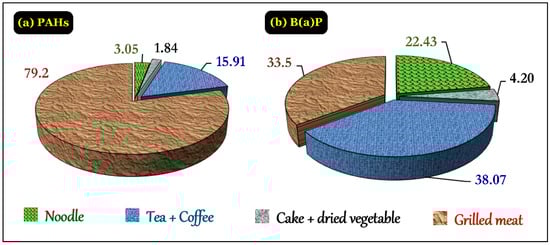 The processing techniques and procedures strongly affected the PAHs contents in the foodstuffs. The PAHs content was primarily detected in the target samples that were directly processed with heat, such as the grilled meat, tea, and coffee samples (Figure 7a). The low-fat samples exhibited the lowest PAHs and B(a)P contents because they were primarily treated by the virtue of drying. Food roasted or fried at high temperatures in oxygen-limited conditions revealed a PAHs infection situation. Food with high fat or directly exposed to PAH emission sources (like tea and coffee), or by both factors (such as grilled meat) had high PAHs and B(a)P concentrations, exceeding the EC threshold (Figure 7b). Moreover, the environmental impact of PAHs such as materials for processing food also affected the concentration of PAHs and B(a)P. Thus, it is recognizable that the processing methods are likely to produce toxins harming human health.