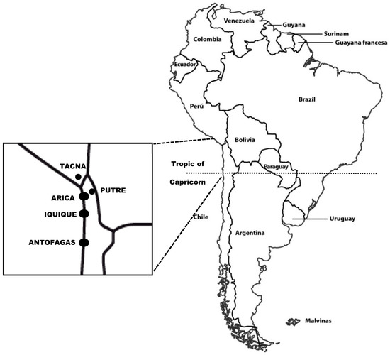 Thus, the genus Nostoc has been an old component of the human diet in South America, and it continues to be used today as a food additive in northern Chile (Arica y Parinacota and Tarapacá Regions) and in southern Peru (Tacna City) (Figure 2) [5,6,8,16,17,18]. However, and based on preliminary interviews, this ancient culinary legacy is disappearing and it is already unknown by the urban communities from other areas of the region; for example, at Antofagasta, the major coastal city in northern Chile, nearly 400 km south of Iquique (Figure 2).