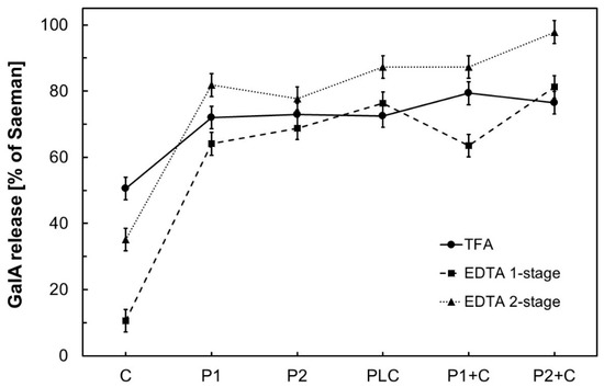 GalA release with EDTA was performed according to Vetter as a combination of EDTA extraction and enzymatic digestion [19]. Therefore, 100 mg of pea hull was suspended in 45 mL Na2-EDTA solution (0.5%). In case of a one-stage treatment, pH of the suspension was adjusted to 4.5 with acetic acid and 2 mL of enzyme solution was added. The sample was incubated for 15 h at room temperature and filtrated for further analysis. For a two-stage treatment, suspension of the sample in Na2-EDTA was additionally adjusted to pH 11.8 with sodium hydroxide (NaOH) solution for the complexation of cations and incubated for one hour at room temperature. Afterwards, pH was decreased to 4.5 and the sample was prepared as described for the one-stage treatment before.