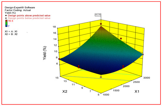 Table 2 shows the experimental values of extracting starch from yellow skin potatoes, indicating the processing conditions at 3000 rpm and 15 min as optimum for the highest yield of extracted starch. From the analysis of variance shown in Table 3, the model was highly significant (p < 0.05), which indicated that the models used to fit response variables were sufficient to display the relationship between the yield of starch and the independent variables. The “Lack of Fit F-value” of 2.06 implies the lack of fit is not significant relative to the pure error. There is a 24.32% chance that a “Lack of Fit F-value” this large could occur due to noise. Non-significant lack of fit is recommended for an adequate model. Both linear and square of X1 (centrifugal speed, rpm) also showed a p-value lower than 0.05. Furthermore, the linear and square of X2 (centrifugal time, min) also showed a p-value lower than 0.05. The interaction between X1 (centrifugal speed, rpm) and X2 (centrifugal time, min) gave p < 0.05, which is considered significant. The R2 of the models for potato starch yield (%) was 0.946.