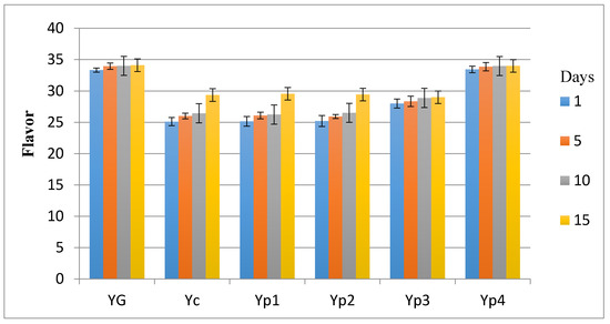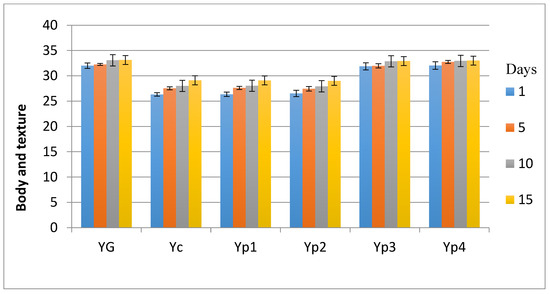 The results in the sensory investigation included appearance, texture, flavor, and acidity, as shown in Figure 3, Figure 4, Figure 5 and Figure 6. The statistical analysis emphasized that there was no significant difference (p > 0.05) between Yp3, Yp4, and YG for all sensory parameters. This study also indicated that Yp1 and Yp2 had the lowest scores in terms of all sensory parameters with the passage of time and were significantly (p < 0.05) lower than YG, Yp3, and Yp4; however, it was not significant (p > 0.05) compared to YC. This finding was similar to those reported by Malik et al. [7], who confirmed that yogurt samples remained satisfactory during storage at 5 °C for 15 days for all sensory parameters due to the different concentration of starch extracted from Trapa bispinosa. In contrast, this present study was not in agreement with Sameen et al. [12], who said that there was no statistical difference between adding a different concentration of starch in manufacturing yogurt and the control sample for all sensory parameters.