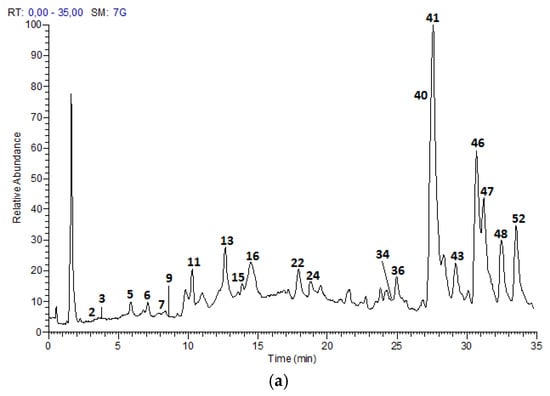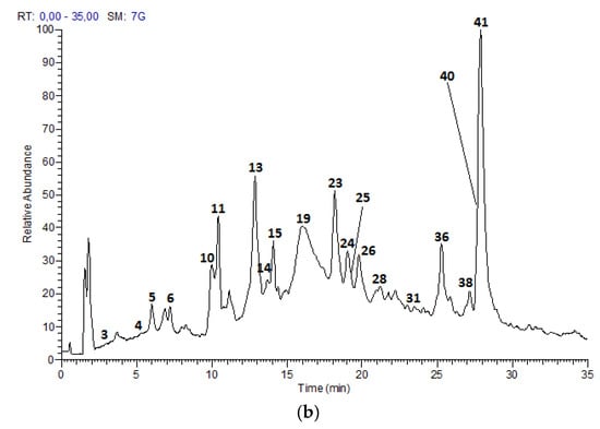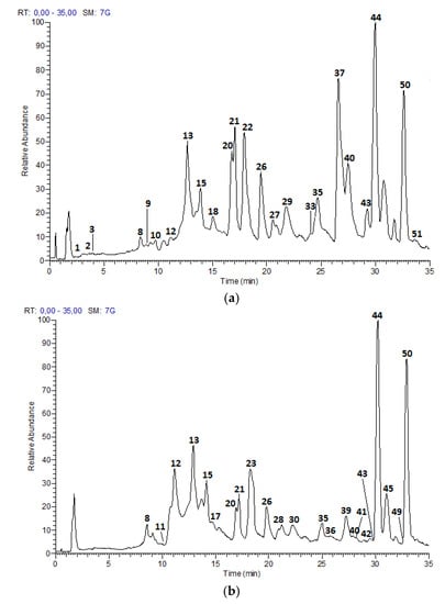HPLC Chromatograms of M. domestica extracts: (a) Anna skins (b) Anna flesh, in a Hypersil Gold AQ RP-C18 column (200 mm × 2.1 mm × 1.9 µm) using a LTQ Orbitrap XL Mass spectrometer (Thermo Scientific™, Walthman, MA, USA) in a mass range from 100 to 2000 amu.