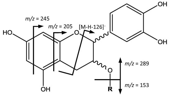 The first common group of compounds, proanthocyanidins, corresponded to oligomers of flavan-3-ols catechin and epicatechin. The monomeric units of these proanthocyanidins are linked through a C4-C8 or C4-C6 bond (B-type), which coexist with an additional C2-O-C7 linkage (A-type) []. Peaks 9 (Rt = 8.87 min) and 15 (Rt = 13.97 min) showed a [M − H]− at m/z 289.0710 (C15H14O6) that correspond to monomers catechin or epicatechin. The main MS2 fragments at m/z 245 and 205, occur through the loss of C2H4O and C4H4O2 due to retro-Diels-Alder fission (RDA) of ring A [].