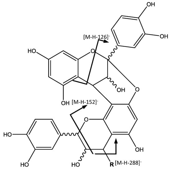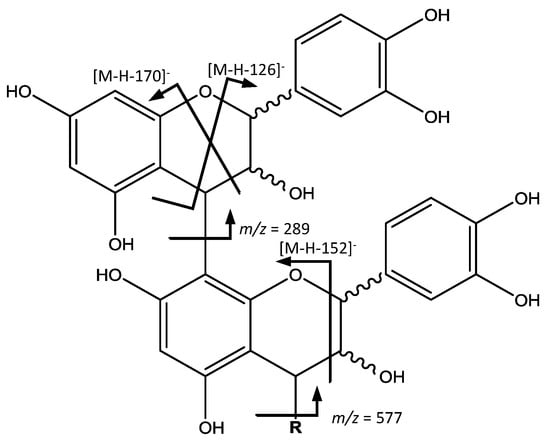 Peaks 1 (Rt = 2.69 min), 8 (Rt = 8.44 min), 13 (Rt = 12.75 min), 38 (Rt = 27.21 min) and 42 (Rt = 28.62 min) show [M − H]− at m/z 577.1344 (C30H26O12), corresponding to procyanidins with B-type linkage (Figure 5), 2 amu (atomic mass units) higher than that of the A-type procyanidin, and major ions containing the structural information at m/z 559, 451, 425, 407 and 289. The ion at m/z 559 [M – H − 18]− originates from water loss. The ion at m/z 451 [M – 126 − H]− results from the elimination of the phloroglucinal as in A-type dimers. The fragment ions at m/z 425 [M – H − 152]− and 407 [M – H − 170]− come from RDA, while the ion at m/z 289 originates from QM resulting in the ion of the monomer [].