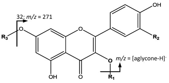 The second group of common compounds, glycosylated flavonol derivatives were elucidated based in the fragmentation pattern from the aglycone due to the loss of glycosides (Figure 6). For instance, peaks 18 (Rt = 14.97 min) and 19 (Rt = 15.90 min) had [M − H]− at m/z 447.0922 (C21H20O11) were identified as kaempferol-hexoside isomers with a main fragment at m/z 285 corresponding to kaempferol []. Peak 32 (Rt = 23.97 min) with [M − H]− at m/z 433.1131 (C21H22O10) showed its main fragment at m/z 271, corresponding to naringenin-hexoside [].