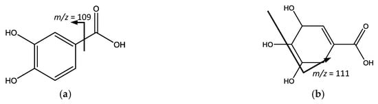 Among the third group of common compounds, acids and derivatives, two small acids correspond (Figure 7) to peak 2 (Rt = 3.36 min) with [M − H]− at m/z 153.0191 (C7H6O4) and a main fragment at m/z 109 [M – H − 44]− due to the loss of CO2 from a carboxylic acid [] identified as protocatechuic acid, and peak 16 (Rt = 14.44 min), with [M − H]− at m/z 173.0454 (C7H10O5) and main fragments at m/z 111 generated from RDA fission, and 93 from subsequent loss of water assigned to shikimic acid [].
