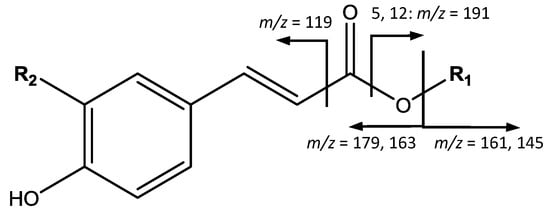 On the other hand, a series of p-coumaric acid derivatives was identified, as shown in Figure 8. For instance, peaks 5 (Rt = 5.95 min) and 12 (Rt = 11.10 min), with [M − H]− at m/z 353.0869 (C16H18O9), are identified as caffeoylquinic acid isomers, with main fragments at m/z 191 [quinic acid−H]−, 179 [caffeic acid−H]−, and 145 due to the loss of CO2 from the quinic acid ion. Peak 6 (Rt = 7.23 min) shows [M − H]− at m/z 341.0872 (C15H18O9), with main fragments at m/z 179 [caffeic acid − H]− and 161 [M – H − 179]−, corresponding to caffeoyl-hexoside. Peak 7 (Rt = 8.30 min) with [M − H]− at m/z 163.0398 (C9H6O3), is identified as coumaric acid due to the fragment at 119 [M – H − CO2]−. Peaks 10 (Rt = 9.94 min) and 11 (Rt = 10.27 min), with [M − H]− at m/z 325.0921 (C15H18O8) are assigned to coumaroyl-hexoside isomers, due to fragments at m/z 163 [coumaric acid−H]− and 145 [coumaric acid−H−H2O]−. Another cinnamic acid derivative was found in peak 17 (Rt = 14.49 min) with [M − H]− at m/z 337.0927 (C16H18O8), and a main fragment at m/z 173 due to the loss of water of the quinic acid ion, thus corresponding to p-coumaroylquinic acid [].