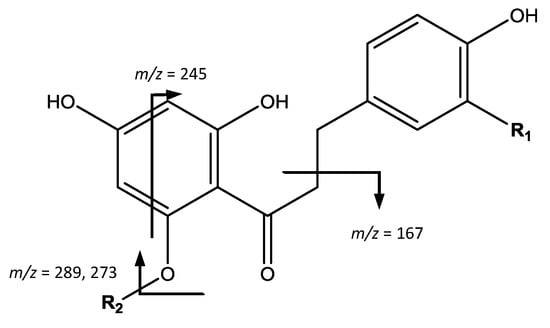 The fourth group of compounds, chalcones, shown in Figure 9, were found only in apples. For instance, peak 35 (Rt = 24.87 min) shows [M − H]− at m/z 583.1660 (C26H32O15) and the main fragment at m/z 289, which correspond to 3-hydroxyphloretin aglycone, allowing to identify the compound as 3-hydroxyphloretin-pentosylhexoside []. Peak 39 (Rt = 27.29 min) shows [M − H]− at m/z 289.0716 (C15H14O6), the same mass and molecular formula of flavan-3-ols, but differs in the fragmentation that occurs at m/z 271 [M – H − H2O]− due to the loss of water, 245 coming from RDA, and 167 due to α-cleavage of the carbonyl group [] therefore being assigned as 3-hydroxyphloretin.