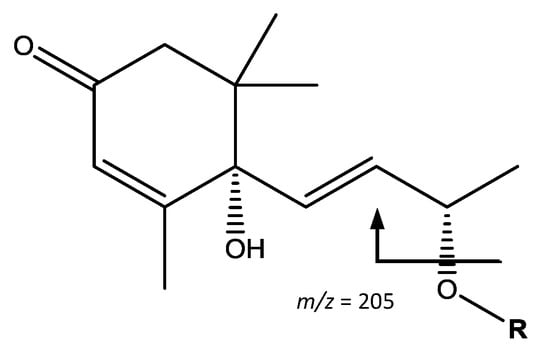 The fifth group of compounds, glycosylated isoprenoid derivatives, shown in Figure 10, was found only in apple. Peaks 20 (Rt = 16.80 min) and 21 (Rt = 17.10 min) showed [M − H]− at m/z 517.2280 (C24H38O12). Their main fragments at m/z 385 [M – H − 132]− and 205 [M – H − 312]− correspond to the loss of a pentoside and a pentosylhexoside respectively. The resulting ion is coincident with vomifoliol, allowing the peaks to be assigned to vomifoliol-pentosylhexoside isomers [].