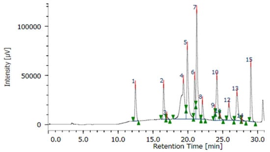 HPLC chromatogram of phenolic acid standards. Peaks 1: gallic acid; 2: protocatechuic acid; 3: catechol; 4: chlorogenic acid; 5: p-hydroxybenzoic acid; 6: vanillic acid; 7: caffeic acid; 8: syringic acid; 9: vanillin; 10: ferulic acid; 11: sinapic acid; 12: p-coumaric acid; 13: benzoic acid; 14: ellagic acid; 15: cinnamic acid.