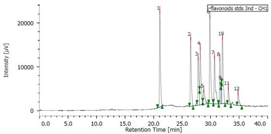 HPLC chromatogram of the flavonoid standards. Peaks 1: esculetin; 2: isoquercetin; 3: myricetin; 4: fisetin; 5: quercetin n-hydrate; 6: quercetin; 7: luteolin; 8: kaempferol; 9: isohamnetin; 10: apigenin; 11: rhamnetin; 12: galangin.