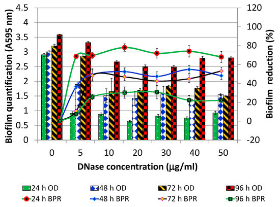 The findings indicate that DNase I pretreatment (10 µg/mL) resulted in BPR of 68%. These findings can be corroborated with a previously published study that reported 40% reduction in biofilms when grown in the presence of 5 µg/mL DNase for 24 h [31]. Pretreatment of DNase at a concentration 5 µg/mL has been reported to reduce E. coli and S. aureus biofilm by 47–54% [32]. It can be concluded that DNase I concentration optimized in the current study for pre-treatment of biofilms is therefore comparable to the published literature.