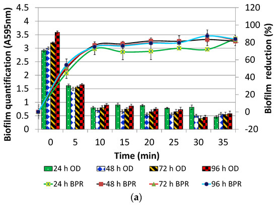The preformed biofilms of P. aeruginosa PAO1 biofilm were treated with 10 µg/mL of DNase I (without Mg2+) for varying contact duration ranging from 0 to 120 min. However, the result as presented in Figure 2a has been shown only until 35 min of contact duration as the observations at other contact durations were more or less similar. Irrespective of the age of biofilm, BPR observed was in the range of 45–53% at contact duration of 5 min and 73–77% for contact duration of 10 min of DNase I treatment. Notably, insignificant difference, irrespective of the age of the biofilms, was observed in BPR when post-treatment was done for more than 10 min (p > 0.05; Figure 2a). Thus, to be on the safer side, 15 min of contact duration was selected for post-treatment.