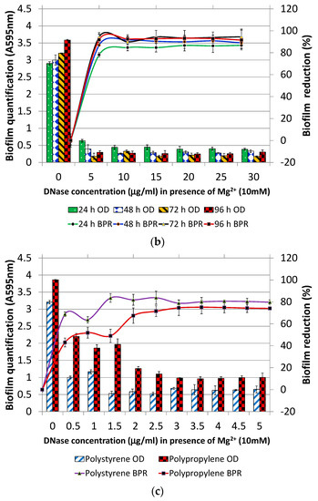 Another valuable outcome of the current study is the synergistic effect of Mg2+ ions on efficacy of DNase I against P. aeruginosa PAO1 biofilms. Introduction of Mg2+ reduced the effective concentration of DNase I by 85% (reduction from 10 to 1.5 µg/mL) to achieve 80% and 75% BPR on polystyrene and polypropylene, respectively. We could not come across any study wherein introduction of Mg2+ has led to such a drastic increase in efficacy of DNase I. However, studies are available wherein introduction of Mg2+ has been reported to restore the antibiofilm effect of DNase I against P. aeruginosa biofilms [36]. Divalent ion, Mg2+ is a cofactor of DNase I and their addition seems to have improved the efficacy of the enzyme. These ions, however, have also been reported to reduce the efficacy of antibiotics [37,38]. Therefore, further studies are required for coming up with a strategy encompassing antimicrobials, DNase and Mg2+ ions for effective control of biofilms.