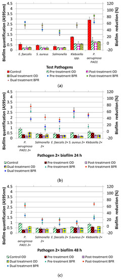 The BPR as a result of three treatments (Pre, Post and Dual) seems to be similar for case-A, as evident by overlapping error bars in Figure 3a and statistical insignificant difference (p > 0.05). In reference to case-B, overall post-treatment was significantly better than pre-treatment (p < 0.05) but on par with dual-treatment (p > 0.05) except P. aeruginosa PAO1 2×, Salmonella Typhimurium 2×. Pre-treatment of Salmonella Typhimurium 2×, E. faecalis 2×, Klebsiella 2× with DNase I resulted in BPR of 7%, 9% and 15%, respectively. It is interesting to note that using pathogen at 2× inoculum level did not result in greater biofilm formation than when they were used at 1× inoculum level, not even in the case of P. aeruginosa PAO1 2×. However, at extended incubation time, control biofilm in case-C was significantly greater than that of case B (p < 0.05). In terms of BPR data, the efficacy of post-treatment was found to be reduced (p > 0.05) when pathogen 2× biofilm was grown for 48 h.
