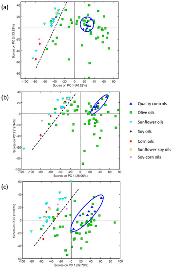Scatter score plots (PC1 vs. PC2) when processing raw HPLC-UV (High performance liquid chromatography method with ultra-violet detection) chromatographic fingerprints of 47 olive oils and 25 other fruit seed oils (sunflower, corn, soy, and some mixtures of them) registered at (a) 257 nm; (b) 280 nm; and (c) 316 nm. Ellipse is grouping the quality controls.