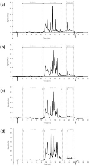 HPLC-UV chromatographic fingerprint registered at 257 nm for four extra-virgin olive oil (EVOOs) obtained from (a) Arbequina; (b) Picual; (c) Hojiblanca; and (d) Cornicabra monovarietal olive cultivars.