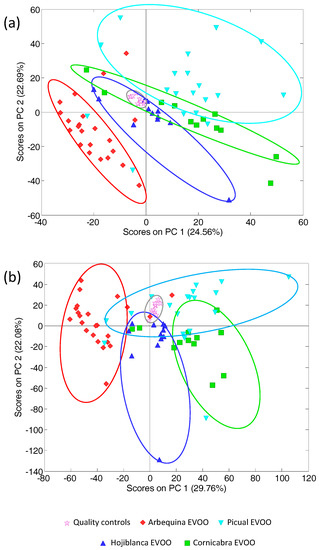 Principal component analysis (PCA) results (scatter score plot of PC1 vs. PC2) in the analysis of 66 EVOOs obtained from monovarietal olive cultivars by employing as data: (a) HPLC-UV chromatographic profile segments of 5–8 min, 13–21 min, and 23–26 min simultaneously (registered at 280 nm); and (b) a combination of the HPLC-UV chromatographic profile segments from 13 to 32 min obtained at 257, 280, and 316 nm, simultaneously.