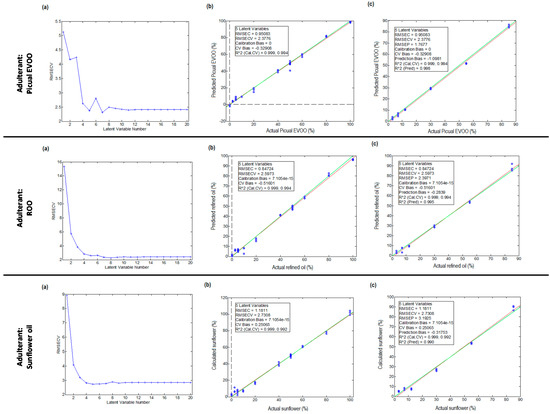 For authentication studies by PLS regression, three cases were considered in which an Arbequina EVOO sample was adulterated with different amounts (from 2.5 to 85%) of a Picual EVOO sample, a ROO sample, or a sunflower oil sample, respectively. Hence, apart from those pure extracts (three samples each), mixtures of the Arbequina EVOO sample and the adulterant oil were as follows: 85% adulterant (3 samples), 80% adulterant (3 samples), 60% adulterant (3 samples), 55% adulterant (3 samples), 50% adulterant (8 samples), 40% adulterant (3 samples), 30% adulterant (3 samples), 20% adulterant (3 samples), 12% adulterant (3 samples), 10% adulterant (3 samples), 7% adulterant (3 samples), 5% adulterant (3 samples), 3% adulterant (3 samples), and 2.5% adulterant (3 samples), for each adulterant oil employed.